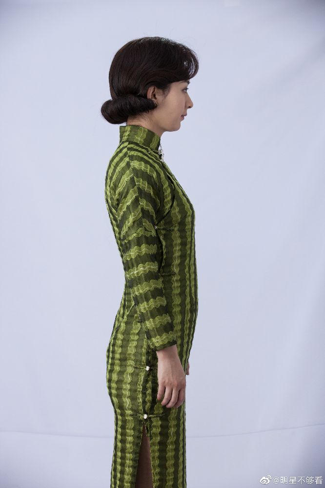 赵丽颖定妆生图,绿色黑色竖条纹长旗袍,纤瘦可爱,整个人端庄了